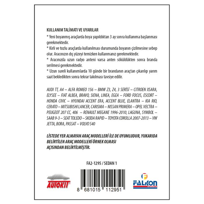 AUDI TT, A4 – ALFA ROMEO 156 – BMW Z3, Z4, 3 SERİSİ – CITROEN XSARA, ELYSEE – FIAT ALBEA, BRAVO, SIENA, LINEA, EGEA – FORD FOCUS, ESCORT – HONDA CIVIC – HYUNDAI ACCENT ERA, ACCENT BLUE, ELANTRA – KIA RIO, CERATO – MITSUBISHI LANCER, CARISMA – NISSAN PRIMERA – OPEL VECTRA – PEUGEOT 207 CC, 406 – RENAULT MEGANE 1996-2010, LAGUNA, SYMBOL – SAAB 9-3 – SEAT TOLEDO – SKODA RAPID – TOYOTA COROLLA 2007-2013 – VW JETTA, BORA, PASSAT – VOLVO S40